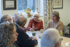 De huiskamer is een schot in de roos blijkt als we er op een willekeurige ochtend binnenwandelen. Alle stoelen zijn bezet! “Mensen hebben dit zo gemist”, weet Joke Grootemaat uit de reacties. Wat biedt de Plaat-Huiskamer de bezoeker? Allereerst een plek om elkaar te ontmoeten. Even weg van thuis. Creatief bezig zijn? Ook dat kan. Wie zijn woning wil verduurzamen vindt er de werkgroep Energie Transitie van de wijkcommissie Bergse Plaat die hier een vaste plek vindt. En als eenmaal zorgorganisaties aanhaken, kunnen bewoners hier met hun vragen en problemen terecht. “De winkeliers van het winkelcentrum zijn blij met ons. We hebben goede contacten. Zeg nou zelf: wie bestelt er anders 75 oliebollen in een keer?”